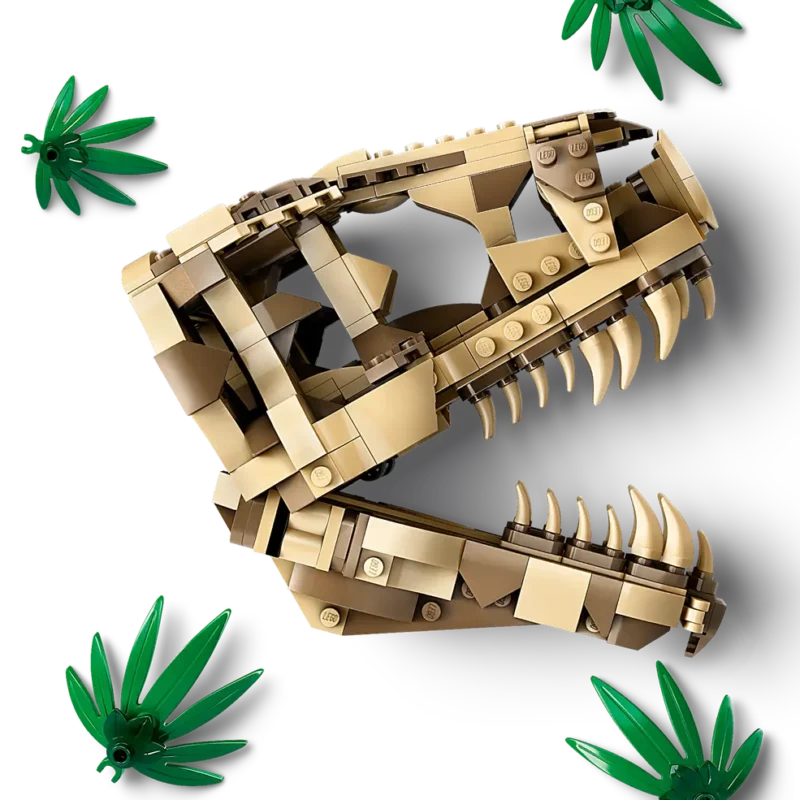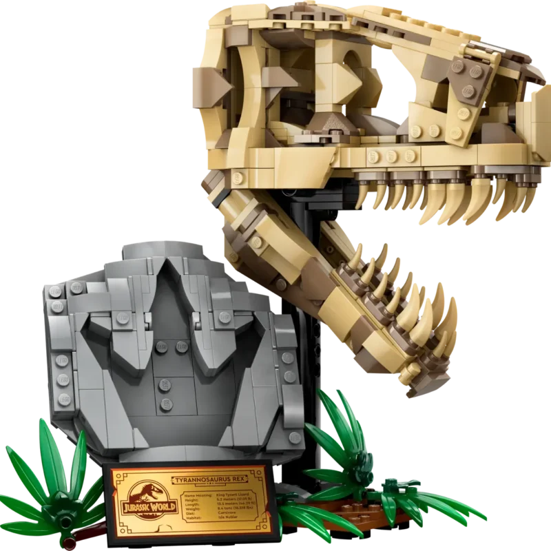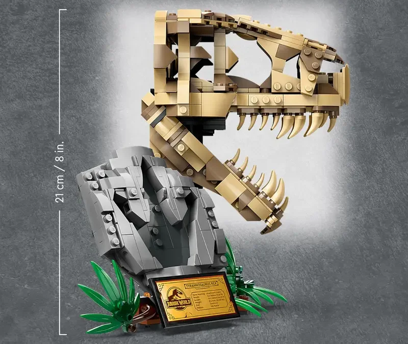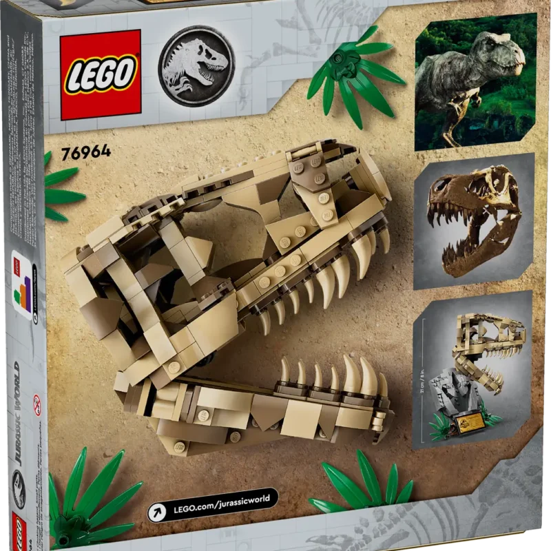 El LEGO Jurassic World 76964 – Fósiles de Dinosaurio: Cráneo de T. rex es un set de exposición que combina construcción relajante y estética de museo. El modelo luce mandíbula articulada para ajustar la pose, una huella “fosilizada” que enmarca la escena y un guiño a la saga con un fragmento de “ámbar” oculto en la parte posterior.