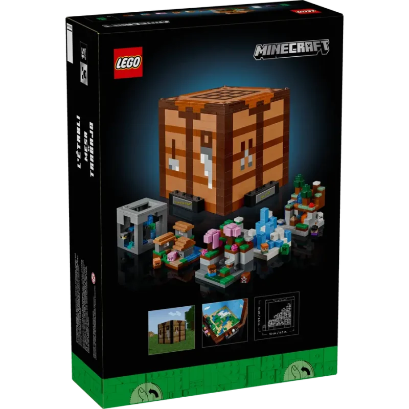 - Incluye: bloque Mesa de Crafteo construible que se abre; mini-escenas interiores; elementos decorativos inspirados en biomas y mobs.