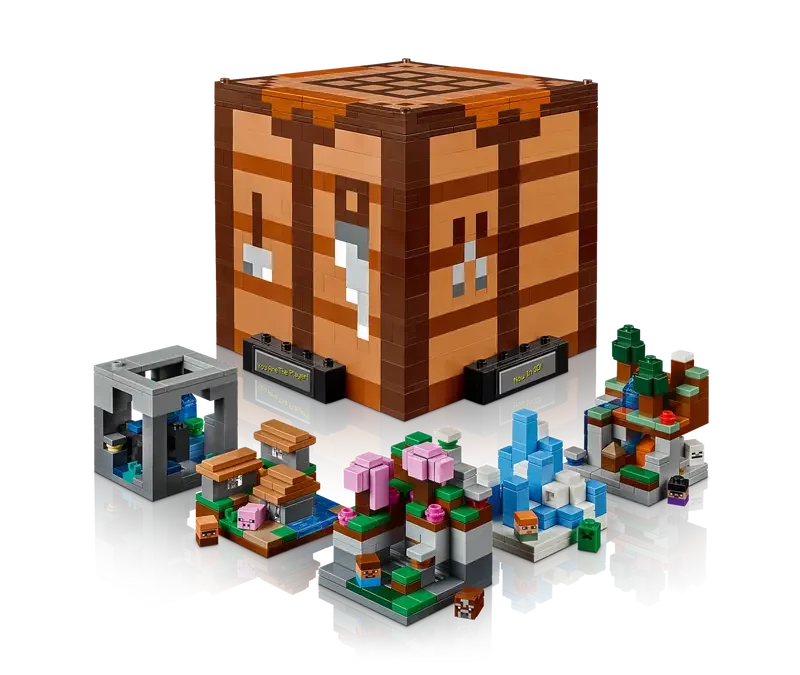 El LEGO Minecraft 21265 – La Mesa de Crafteo reimagina el bloque más útil del juego como un modelo display que se despliega para revelar un interior repleto de biomas y escenas en micro-escala.